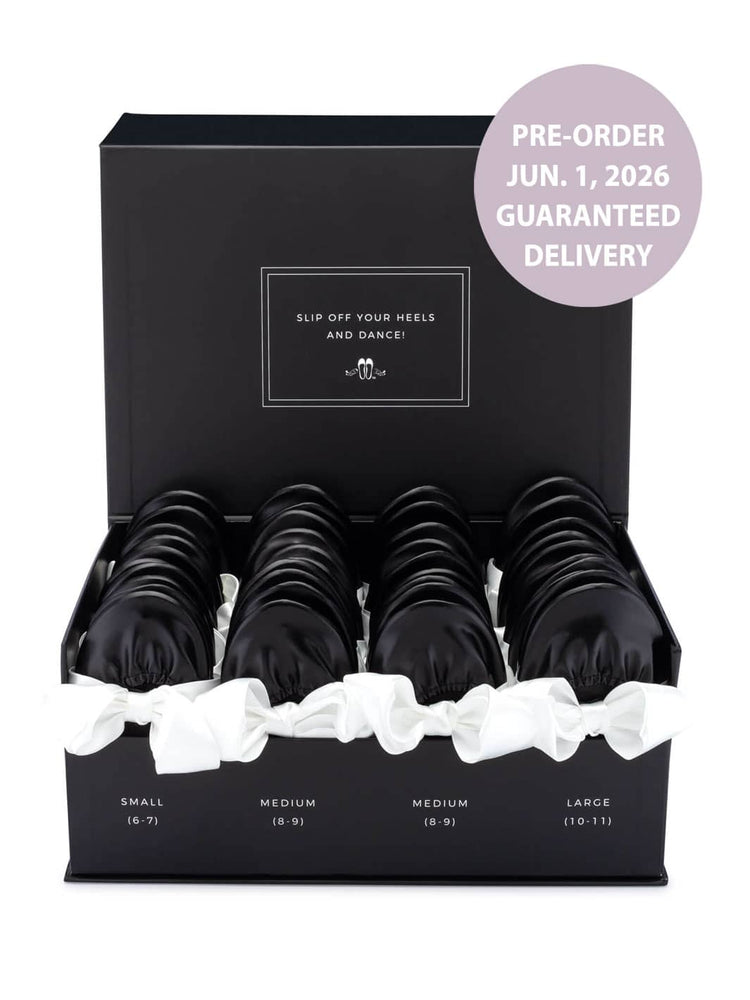 Our wedding box sets include our most popular sizing and are generally what you will need for most wedding guests. If you would like to customize your sizes, we recommend topping up with our Single Pairs available in women’s sizes 4-13. We are not able to customize the sizing in the box sets.